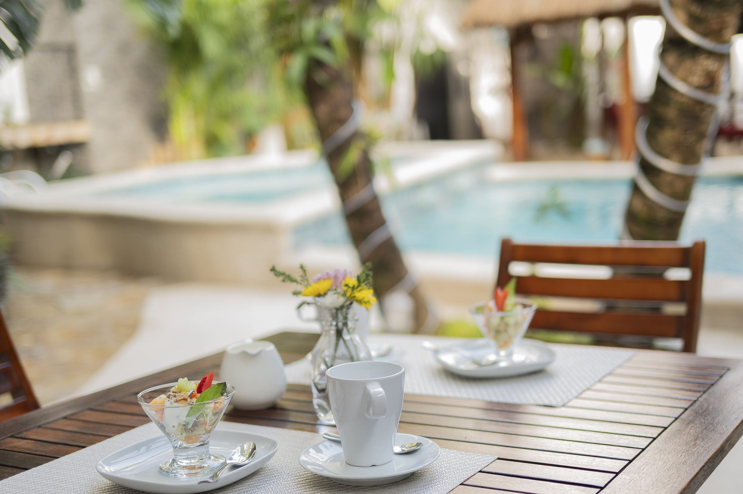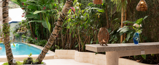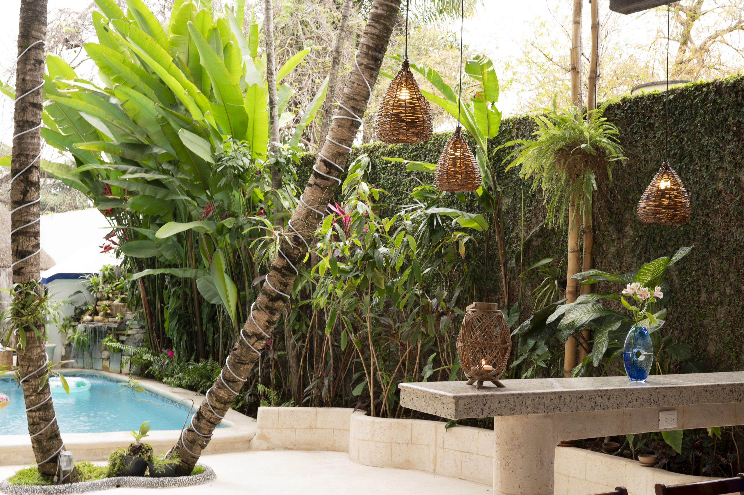 Disfruta de una vista amplia y relajante hacia el exuberante jardín y la refrescante piscina.