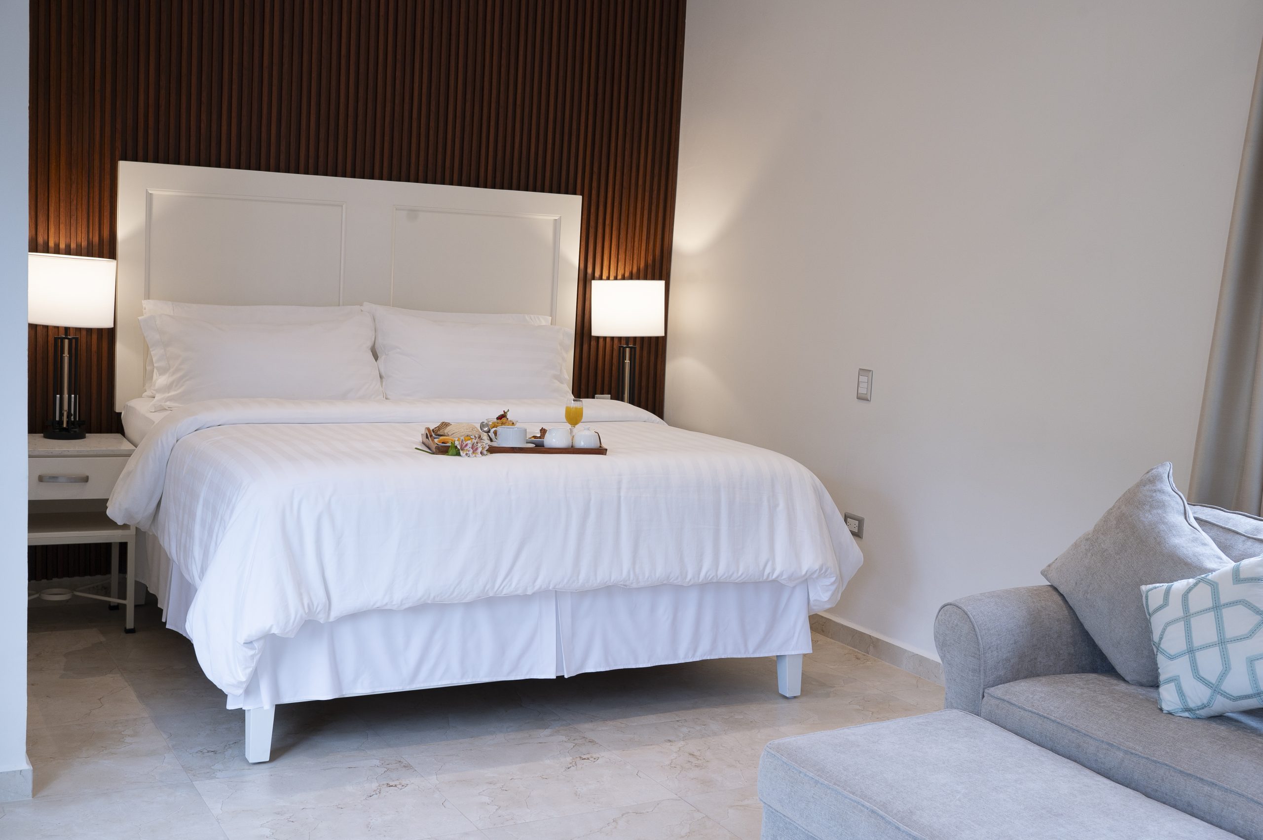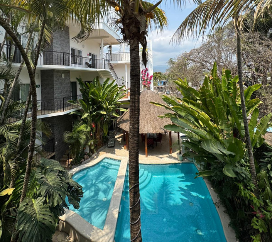 Hamaca, queen con balcón, vista al jardín y frente a la piscina.