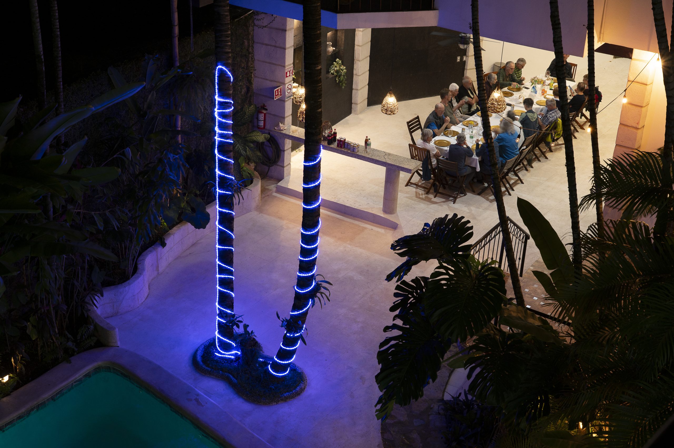 Hamaca, Vista jardín, piscina y balcón, puesta del sol entre las palmeras, vista panorámica.